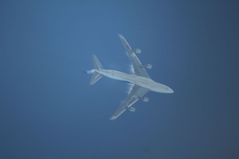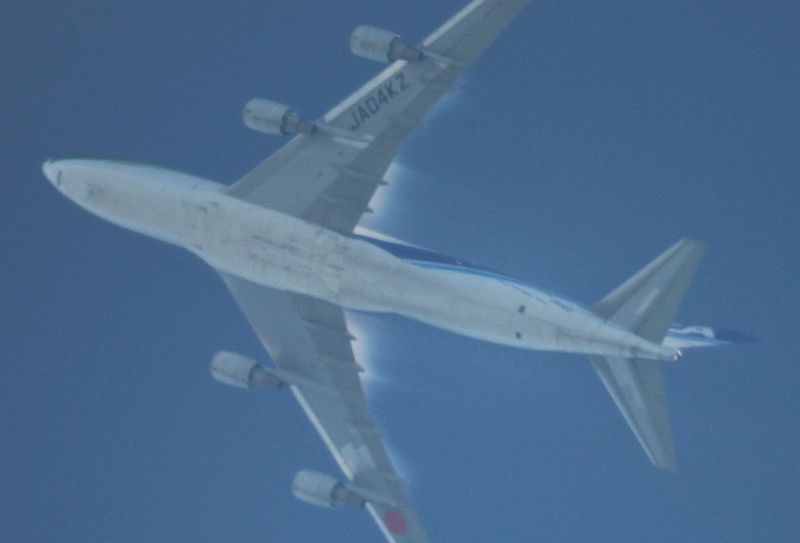 Wie man sieht kommen die angeblichen "Chemtrails" nicht aus den Triebwerken! Ebenso kann man Düsen ausschließen, da die Streifen von einem Großteil der Tragflächen kommen und nicht aus spitzen Düsen. Das Flugzeug flog in 28.000 Fuß (9,2km) und hatte beim Anflug tiefer am Himmel gar keinen Kondensstreifen. Erst bei ca. 60° Höhe im Süden (ca. SSW) entstanden Streifen. Diese verschwanden langsam bei ca. 70° Höhe im Norden (NNO). Es handelt sich dabei um keine normalen Kondenssteifen sondern um Kompressionsstreifen.