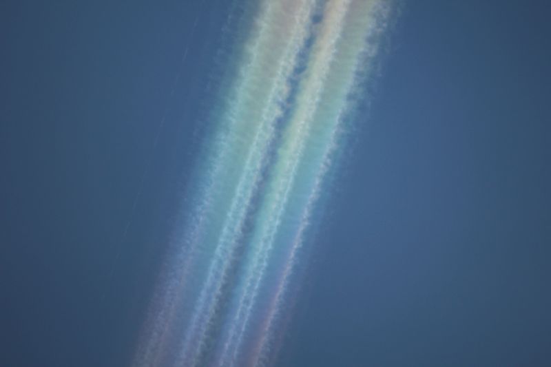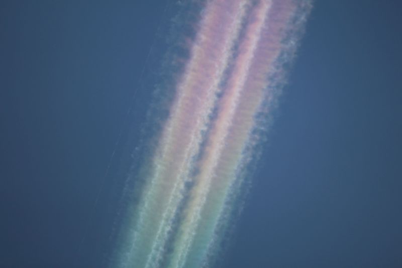 Derartig farbige Kondensstreifen werden von Chemtrails-Theoretikern als "Chembow" (chemischer Regenbogen) bezeichnet. Dabei sind es irisierende Wolken aus Wasser - Eiskristallen.