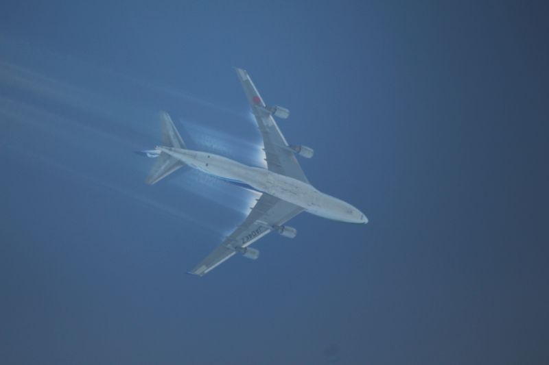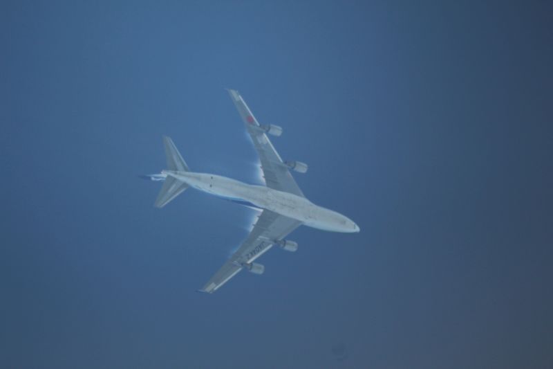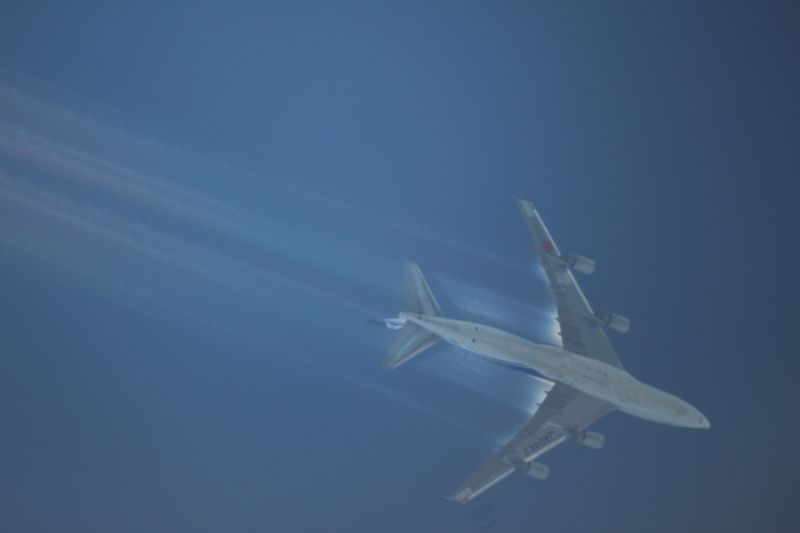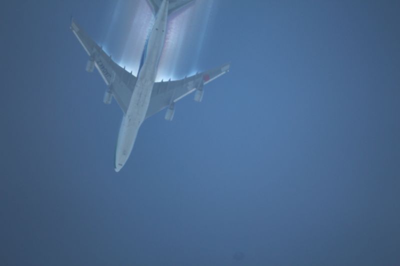![]() Nach dem Überflug verschwanden die Streifen wieder. Die Tatsache, daß direkt an den Tragflächen noch "Nebel" sind zeigt, daß es keine Sprühungen mit Aluminiumoxid usw. sein können, da sich diese nicht auflösen würden.