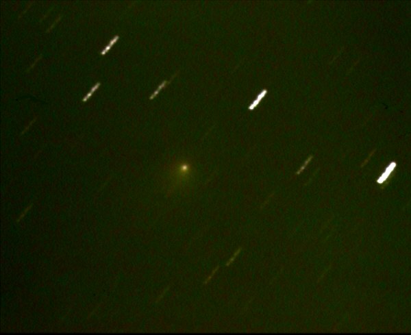 Es wurden 53 Aufnahmen à 30s auf den Kometen addiert und ein Flat Field abgezogen, um das Mondlicht zu eliminieren.