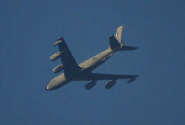 Von Chemtrails-Theoretikern wird auch behauptet, daß militärische Boeing KC-135-Flugzeuge systematisch Chemtrails versprühen (Bild). In Wirklichkeit wurde ein Vereisungstest mit Wasser durchgeführt - Original siehe hier! Ich habe bisher sicher 1000 Verkehrsflugzeuge im Teleskop beobachtet aber nur eine KC-135, und zwar am 12.7.2005. Und diese hatte - wie man sieht - keine Chemtrails versprüht!