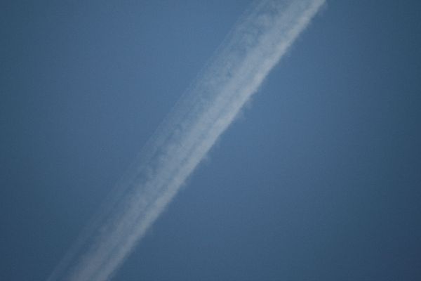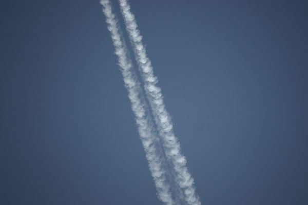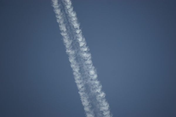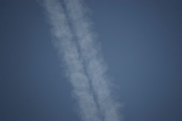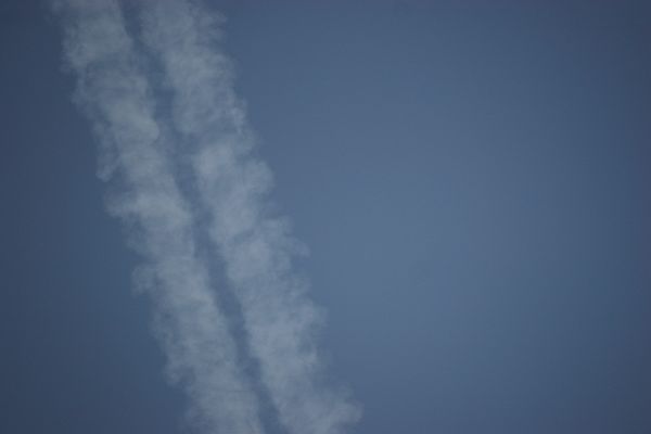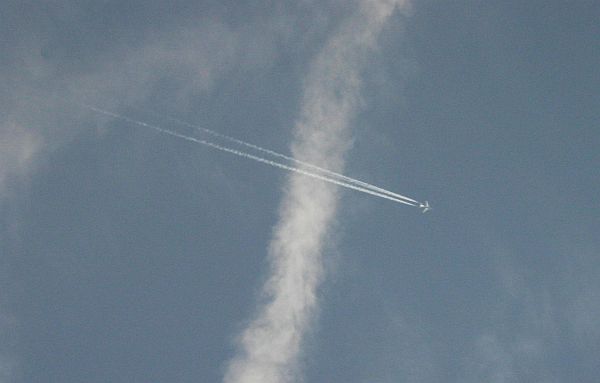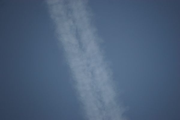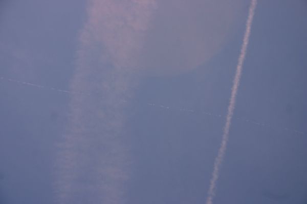 Auf diesem Foto sieht man 2 Kondensstreifen zweier Flugzeuge, die im Abstand von einigen Minuten parallel zueinander flogen. Das zweite habe ich selber beobachtet, als es am Kondensstreifen des ersten vorbeiflog. Offenbar flogen sie auf gleicher Höhe bei sehr ähnlichen Luftverhältnissen. Jedenfalls konnte ich beobachten, daß das 2. Flugzeug einen ganz normalen gleichförmigen Kondensstreifen hinterließ, der sich an manchen Stellen schneller, an anderen weniger schnell auflöste!