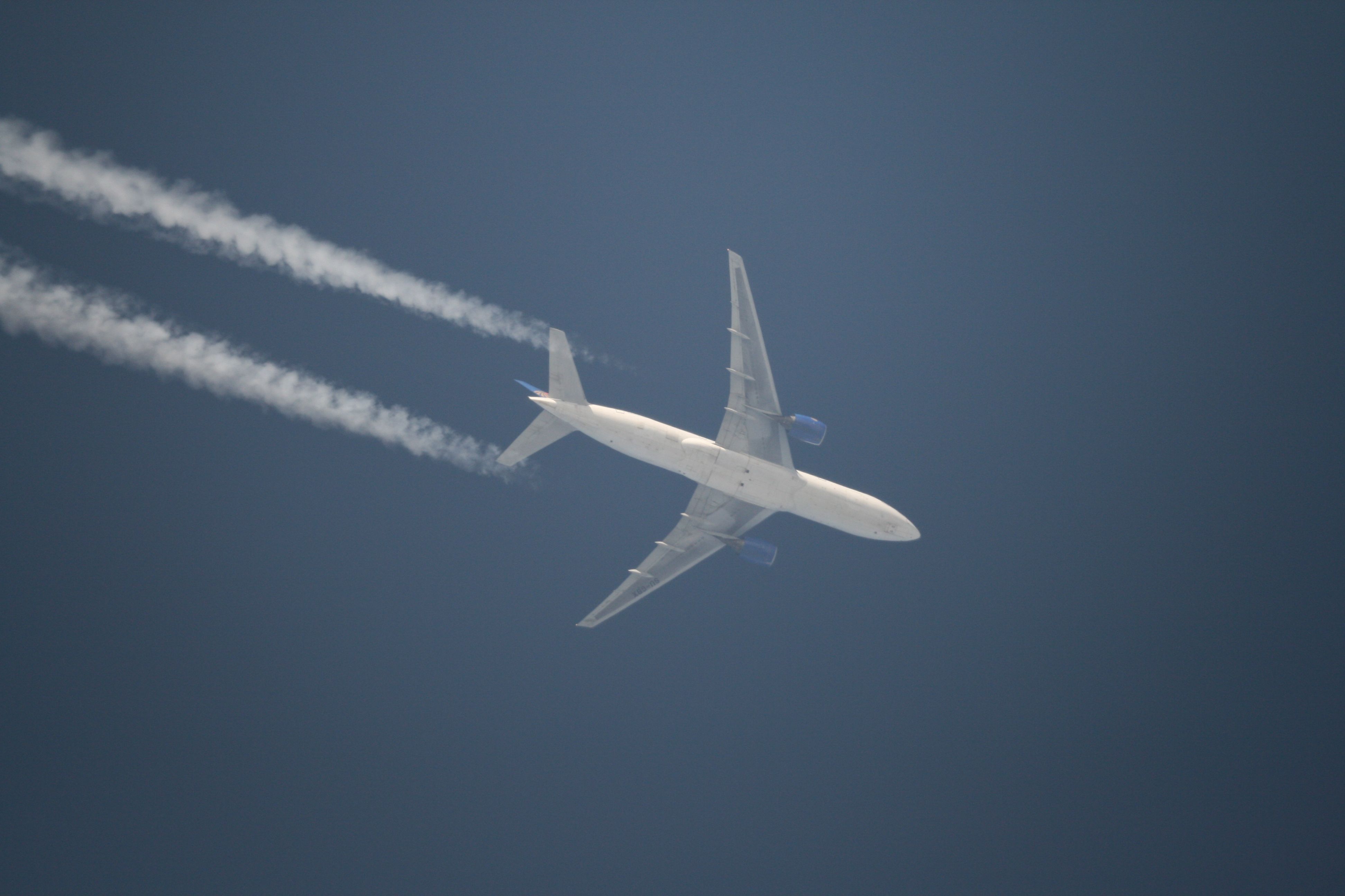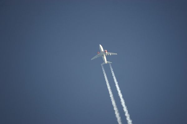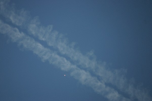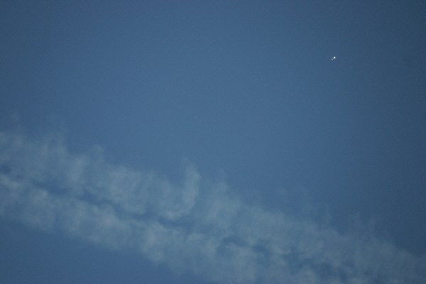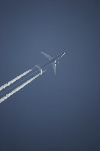 Allerdings sieht man auch hier, daß die weiße Farbe des Kondensstreifens hinter dem Flugzeug deutlich intensiver wird als direkt am Triebwerk. Diese British Airways Boeing 747 hinterließ einen etwas stabileren Kondensstreifen, aber keinen fetten "Chemtrail". Die Flughöhe hebe ich nach der weiter unten vorgestellten Methode zu 12,4 +/- 0,3 km berechnet.