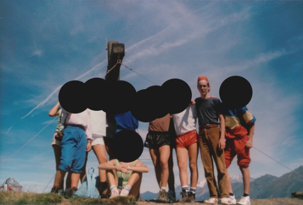 Zu guter Letzt: Chemtrails-Theoretiker behaupten, daß es vor 1995 noch keine Sprühflüge gegeben habe und daß es auf älteren Fotos derartige Wolkenformationen nicht gäbe! Dieses Foto stammt jedoch vom Herbst 1986, als ich in Südtirol im Schullandheim war. Meine Klassenkameraden habe ich aus Datenschutz-Gründen schwarz markiert. Der Junge fast rechts bin ich. Im Hintergrund sieht man typische "Chemtrails" - Kondensstreifen und "Chemtrails"-Cirruswolken, die es - so die Verschwörungstheoretiker - damals gar nicht geben durfte, sondern erst seit 1995!