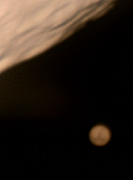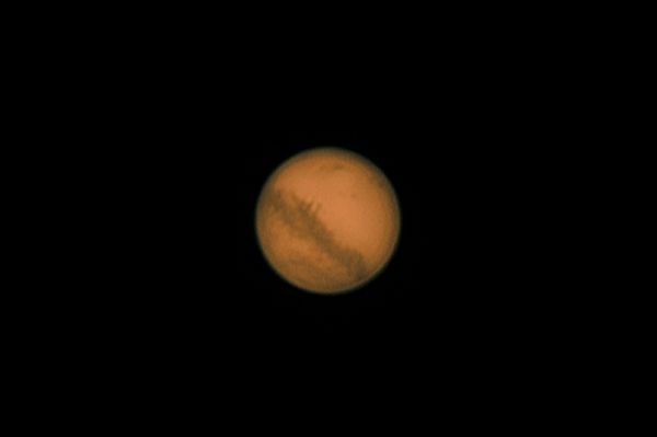 Mars und Mond am 24.12.2007 um 4:53MEZ Am Montag, dem 24. Dezember 2007 konnte man in Teilen Mitteleuropas eine Marsbedeckung sehen - genau an dem Tag, an dem Mars seine Oppositionsstellung zur Sonne erreichte! Gegen 4:45 MEZ wurde Mars vom Vollmond bedeckt, gegen 5:10 trat er wieder aus. Der Monduntergang war erst gegen 9:00 MEZ. Somit konnte das Ereignis sehr gut beobachtet und fotografiert werden - falls das Wetter mitmachte. Der Mars wurde nicht in ganz Deutschland bedeckt, im Nordosten sah man eine längerandauernde Bedeckung während im Südwesten lediglich eine enge Begegnung zu beobachten war. Mit Videoastronomie (WebCam oder Digitalcamcorder am Teleskop) konnte das Ereignis gut fotografiert werden, ebenso mit einer Spiegelreflexkamera. Von Vorteil war, daß der Mars und der Mond eine ähnliche Flächenhelligkeit haben. Da das Wetter bei mir ausgezeichnet war habe ich mit der Digitalkamera und der Web Cam am Teleskop Bilder machen können, die unten zu sehen sind. Martin Wagner, 24.10.2007