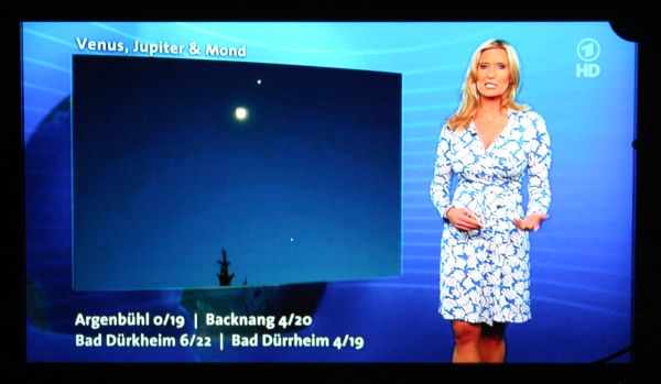 Mond, Venus, Jupiter vom 26.3.2012 am 27.3.2012 ca. 19:55 im der SWR-BW mit Namensnennung Gegen 18:20 kam es auch in RBB Fernsehen mit Namensnennung
